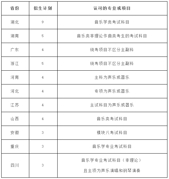 2.参加所在省级招生考试部门组织的音乐类专业统一考试并达到该省划定的合格线,取得音乐类专业省统考合格证且专业测试科目的主项必须为声乐、器乐、钢琴中的一项。具体如下: