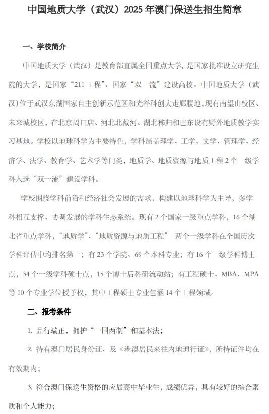 中国地质大学(武汉)2025年澳门保送生招生简章